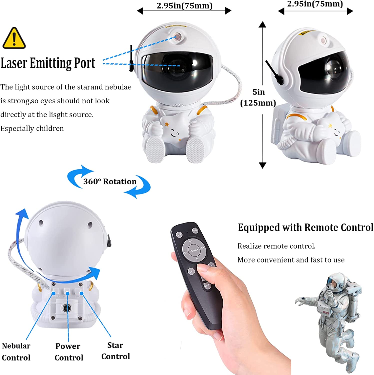 2η έκδοση αστροναύτη αστέρι προβολέα Η νέα μας έκδοση αστροναύτη Star Projector σχεδιάστηκε για να είναι ένα μίνι νυχτερινό, είναι μικρου μεγέθους, έτσι ώστε να μπορείτε να συσκευάσετε σε carry-on ενώ εν κινήσει. Ο συνδυασμός των νεφελωμάτων μπορούν να ενεργοποιηθούν σε συνδυασμό (μέχρι 17 επιλογές λειτουργίας) και η προβολή της ροής των νεφελωμάτων δημιουργεί μια χαλαρωτική ατμόσφαιρα. Το νυχτερινό φως του νυχτερινού προβολέα του αστροναύτη, αντανακλώντας το θέμα του αστεριού και του γαλαξία, που σας παίρνει για να εξερευνήσετε τον τεράστιο χώρο. Έχετε 2 τρόπους για τον προβολέα φωτός αστροναύτη: τα πίσω κουμπιά και το τηλεχειριστήριο. Το κουμπί στο πίσω μέρος μπορεί να ενεργοποιήσει μόνο τον προβολέα, το Nebula & Star Switch και το Long Press για να το απενεργοποιήσετε. Το τηλεχειριστήριο μπορεί να ρυθμίσει το χρώμα του νεφελώματος, τη φωτεινότητα του νεφελώματος, την ταχύτητα ροής του νεφελώματος, τον τρόπο αλλαγής του αστεριού, τη φωτεινότητα των αστεριών, την ταχύτητα των αστεριών και την ενεργοποίηση/απενεργοποίηση των αστεριών.【Μοναδική και ευέλικτη μαγνητική κεφαλή περιστροφής 360 °】- Η κεφαλή και το σώμα του νυχτερινού φωτός προβολέα του του είναι συνδεδεμένα με μαγνήτες, είναι αποσπώμενο. Έτσι μπορείτε να το εφαρμόσετε με την περιστροφή του κεφαλιού ή να το βγάλετε από το σώμα και το Project Starry και το Nebula οπουδήποτε θέλετε, παρέχοντας ένα θαυμάσιο και ονειρικό περιβάλλον για το μωρό σας/υπνοδωμάτιο/σκηνή/κάμπινγκ/κάμπινγκ/ . 【Τα καλύτερα δώρα για οποιονδήποτε】- εναι Το καλύτερα δώρο για τα γενέθλια των παιδιών, βοηθά τα παιδιά να εμπνεύσουν την περιέργεια, τη φαντασία και τη δημιουργικότητα, Ιδανικό για να διακοσμήσετε υπνοδωμάτιο, αίθουσα παιδιών, οικιακό θέατρο, οροφή, παράθυρο, διακοσμήσεις πάρτι, γάμο, γενέθλια.και τη διασφάλιση της υγείας και της ασφάλειας των πελατών. Ο προβολέας Light Galaxy είναι πιστοποιημένος FCC, ROHS και CE. Εάν έχετε προβλήματα με το Light Galaxy Light του Star Projector, παρακαλούμε να επικοινωνήσετε μαζί μας, παρέχουμε 180 ημέρες μετά την υπηρεσία πωλήσεων. Όταν το χρησιμοποιείτε, μην κοιτάτε απευθείας την πηγή φωτός, μπορεί να βλάψει τα μάτια σας, ειδικά τα παιδιά σας.